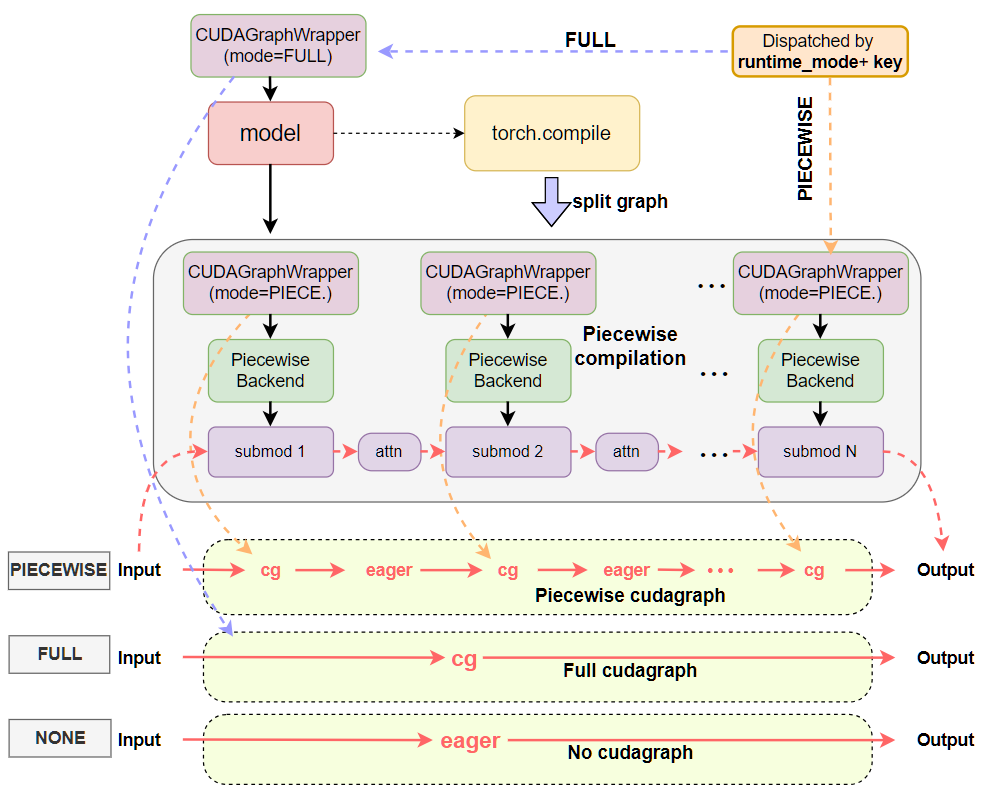 While NONE , PIECEWISE, and FULL are single-mode configurations and simply equivalent to past implementations of eager execution, piecewise CUDA Graphs, and full CUDA Graphs respectively, FULL_DECODE_ONLY and FULL_AND_PIECEWISE are newly appended dual-mode configurations, which require dispatching to switch between concrete runtime modes according to runtime batches dynamically.